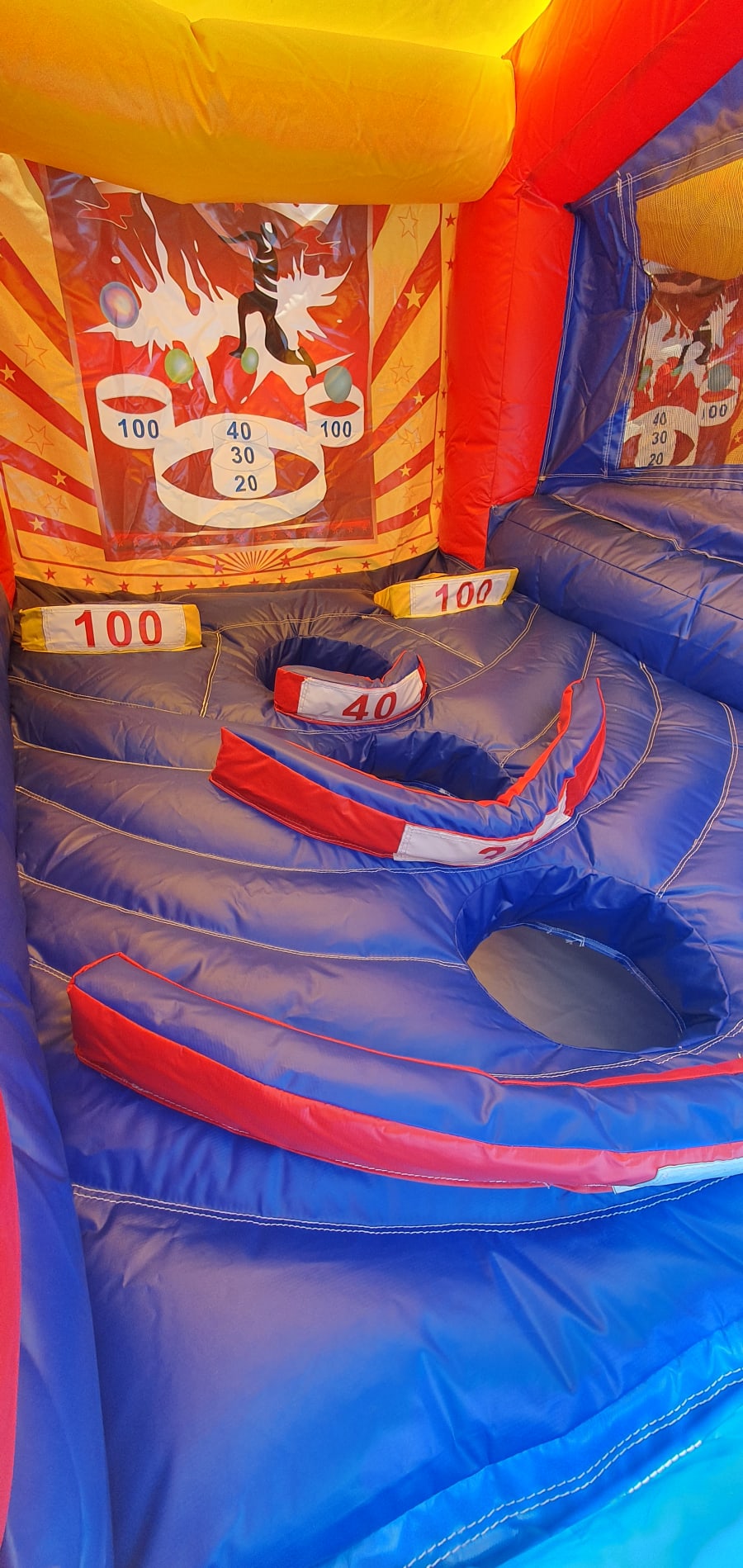 The inflatable skee ball game typically includes multiple target holes arranged in a row, along with a ramp that players can use to roll the balls towards the targets. The game can be played solo or in teams, and the points earned by each player or team are displayed on a scoreboard.